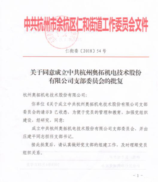 2018年6月27日,經中共杭州市余杭區仁和街道工作委員會批準,我公司正式成立中共杭州奧拓機電股份有限公司支部委員會。