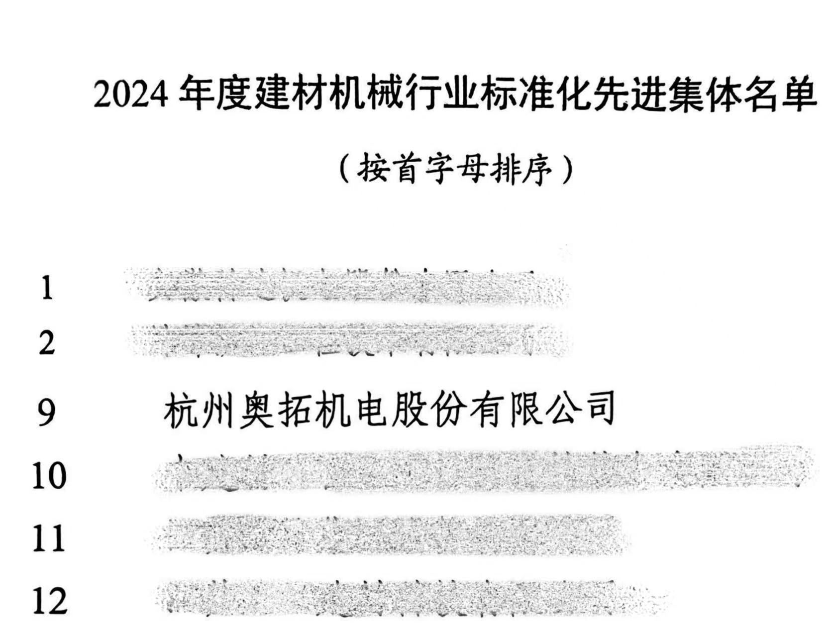 會議期間,為表彰在2024年度建材機械行業標準化工作中做出貢獻、積極參與標準化工作的集體和先進工作者,授予杭州奧拓機電股份有限公司等24家單位為“2024年度建材機械行業標準化工作先進集體”榮譽稱號。
